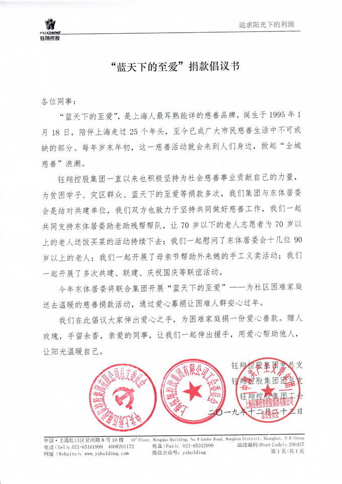 12月23日,鈺翔控股集團黨總支、團總支、工會聯合倡議,要求集團黨團員積極參與“藍天下的至愛”慈善捐款活動,經過幾天的發動和收集,共收到愛心捐款近4000元,12月27日,集團黨總支秦祖煌書記愛心善款轉交到了東體居委黨總支范晟華書記的手里。此次活動由鈺翔控股集團黨總支與曲陽路東體居委會聯合主辦,目的是為社區困難家庭送去溫暖,讓困難人群安心過年。