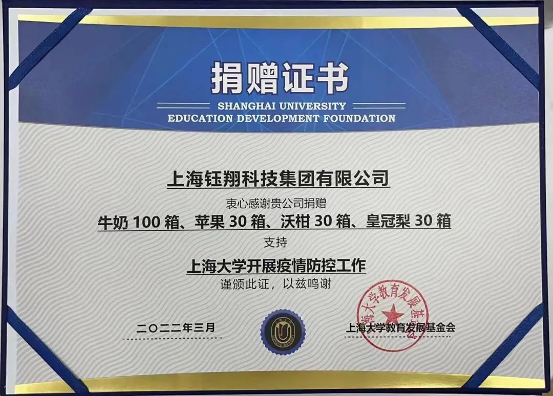 在得知上海大學封閉管理后,3月10日上午,“兩新”組織鈺翔集團黨總支組織安排支援上海大學疫情防控工作,及時為上海大學師生捐贈90箱水果、100箱牛奶等物資。