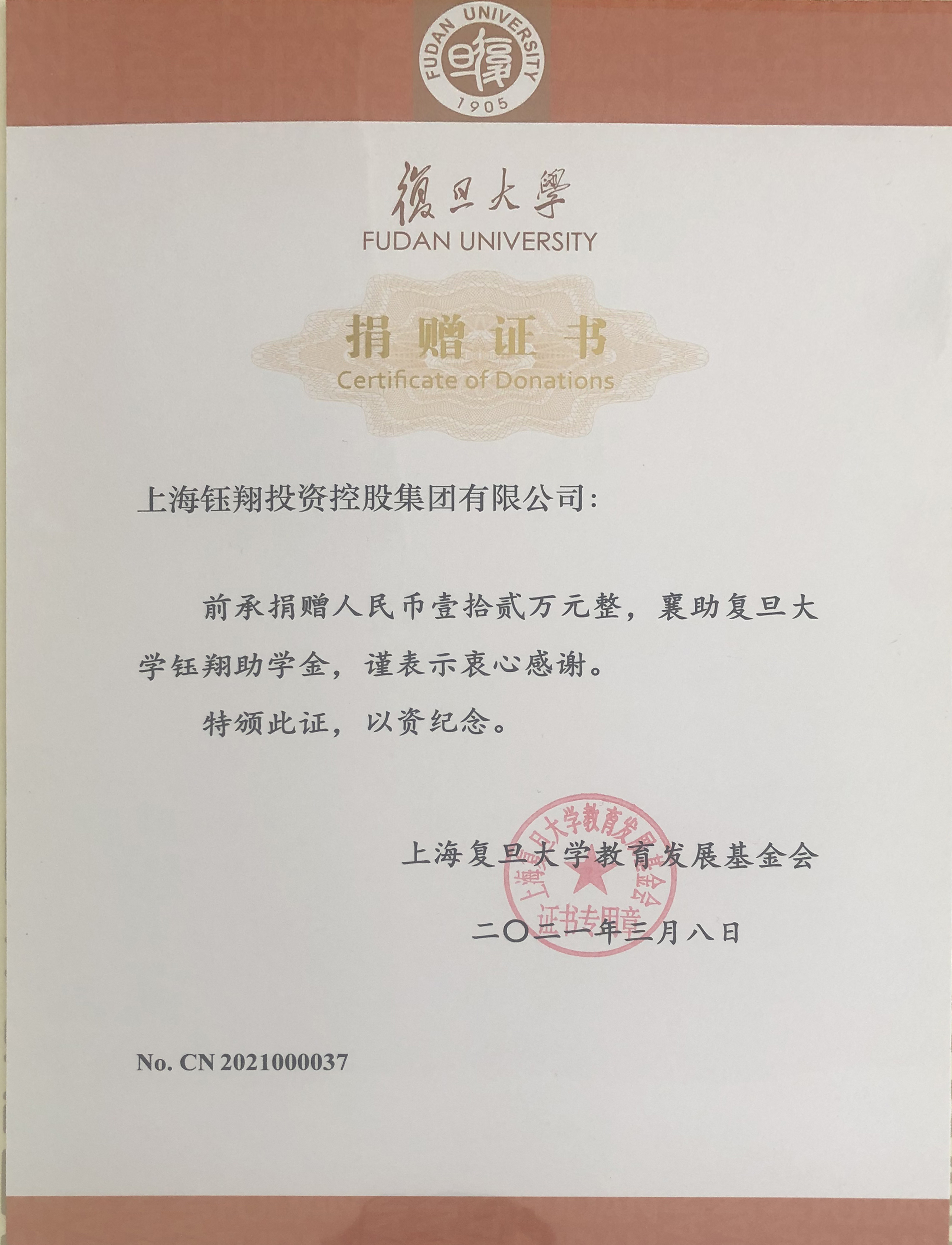 上海復旦大學教育發展基金會12萬元捐贈證書
